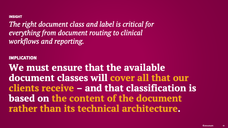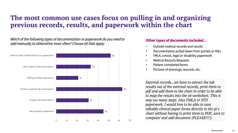 As the initiative continued, we recognized that incorporating manually added documents into our understanding was an important addition to our framework. Many of the documents that practices bring in manually either augment or replace information that’s brought in from outside - so many of the opportunities we were considering could be applied easily to both external and internally added documents.