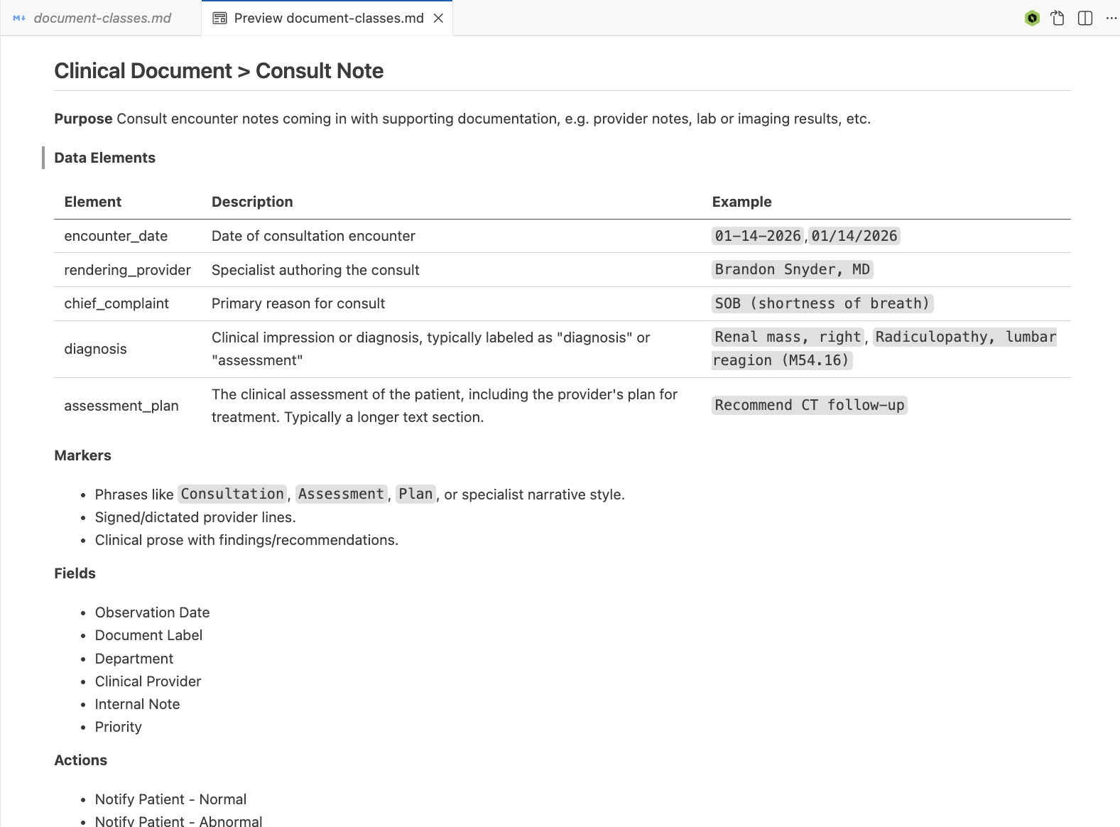 One of the other major opportunities we found in our research was a need for additional document sub-classes to represent the various types of documents clients were trying to build workflows around. For this, I created a document that covered the proposed classes and rationale. I also created a detailed Markdown file with information I had gathered from our previous research on the highest-value Clinical and Administrative Document classes.
